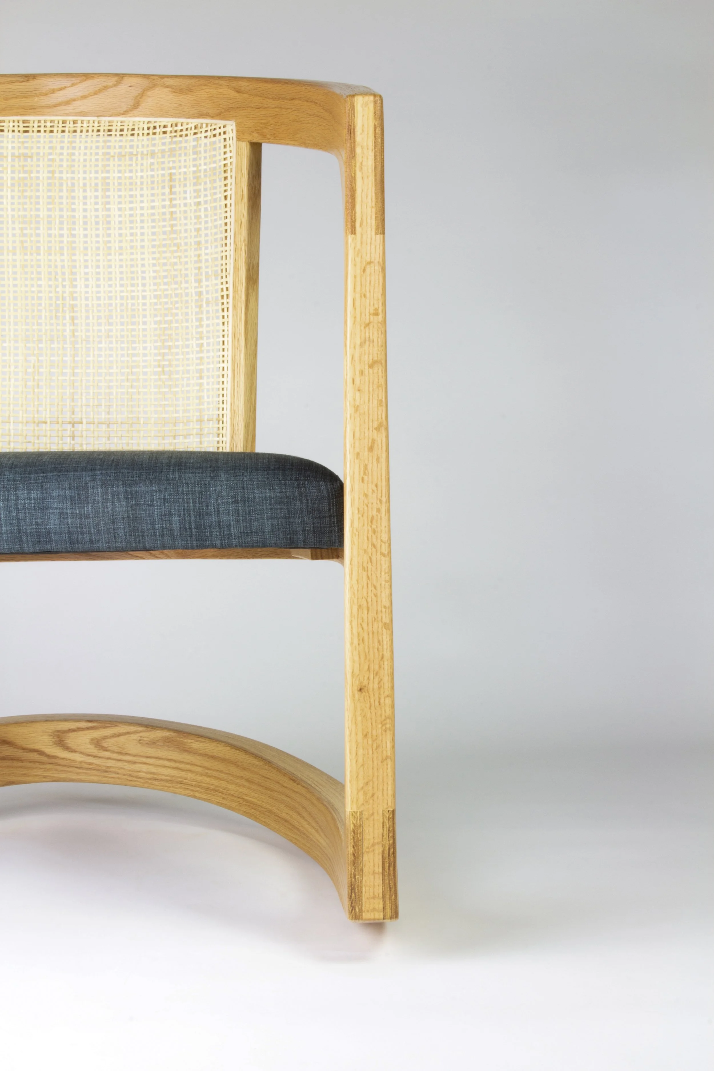 Made from red oak with bent lamination, bridle joints, and Swedish Modern-style caning. She’s got a modern sensibility and touch of ‘70s retro gentle rocking vibes.